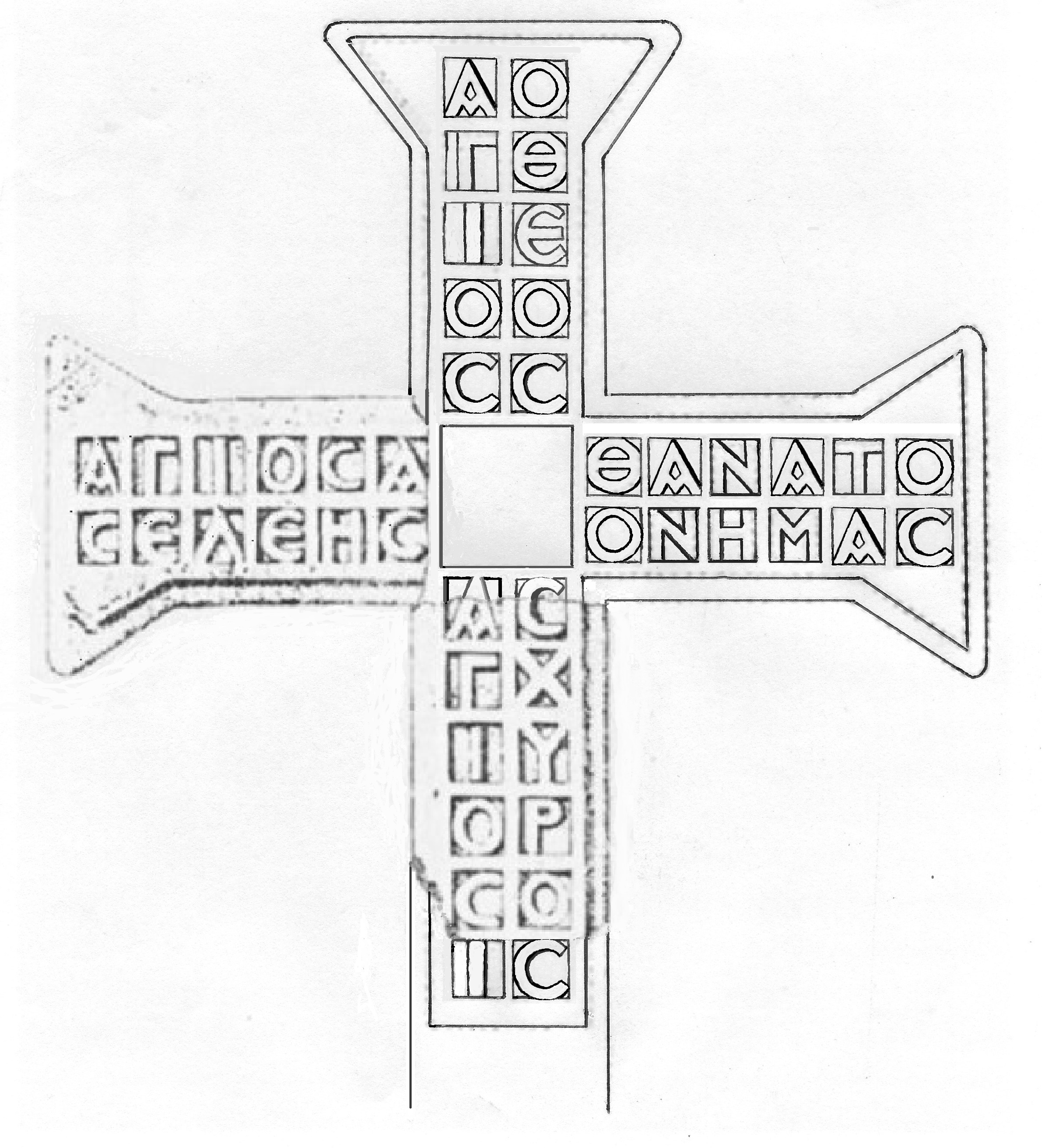 Above is my reconstruction of what the original processional cross may have looked like. You can see that all that remained of the ancient cross was the right arm (on the left as you view it) and about ¾ of the bottom. The Trisagion (Thrice Holy) Hymn, first attested to in the mid-5th century, is inscribed on the cross. The hymn is a supplication to the Trinitarian God; “Holy God, Holy Mighty, Holy Immortal, have mercy on us.” It is still chanted in every Orthodox Divine Liturgy service. The text is uncial (or majuscule) Greek; all uppercase letters, no spacing between words, no diacriticals. This was the standard until the 9th century. It is inscribed in the order that an Orthodox person holding the cross would cross themselves: top to bottom, right shoulder to left.